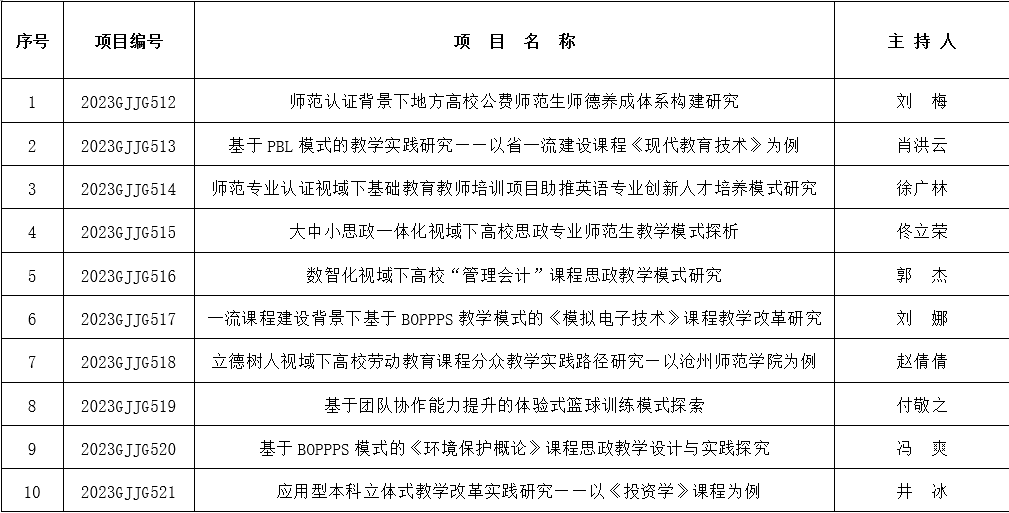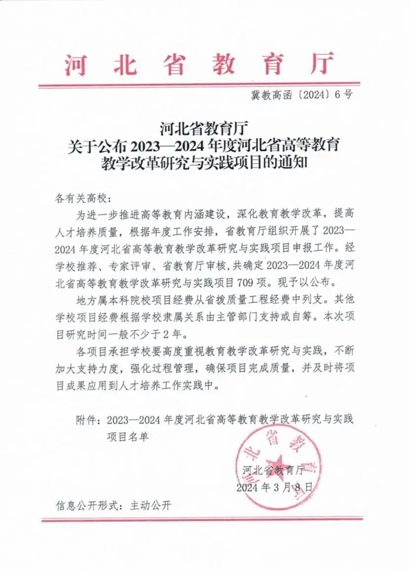 近日,河北省教育厅发布了《河北省教育厅关于公布2023-2024年度河北省高等教育教学改革研究与实践项目的通知》(冀教高函〔2024〕6号),必赢官网推荐的10项教育教学改革研究与实践项目经过专家评审和教育厅审核,成功获得立项。
