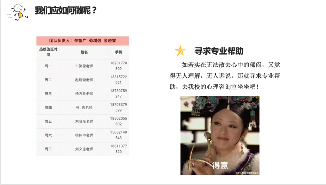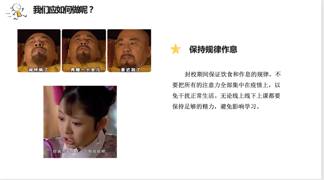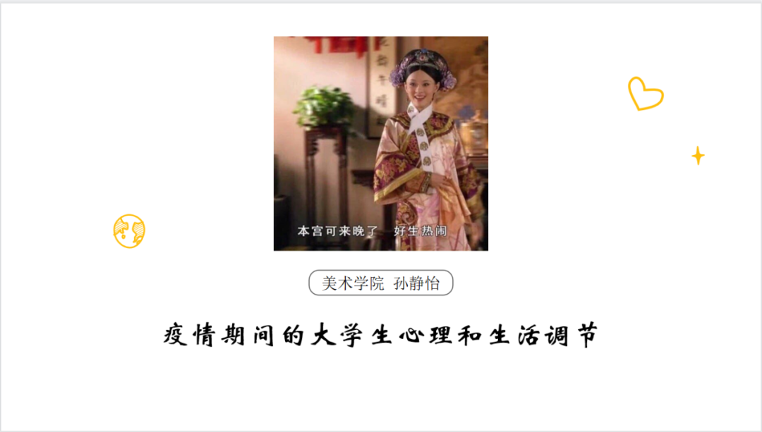 讲座中孙静怡老师结合了辅导员工作中的丰富实际的案例和经验分享,内容翔实接地气,同时精心制作了多个贴近的小视频。孙静怡在讲座中提到:“在面对突然压力时,我们首先要坚定信心,正视疫情,服从规定;其次要保持乐观的心态;再次,一定要保持规律作息,保持适度运动,保持人际交往关系,不忘记自己作为学生学习的天职,完成学习计划,充实自己的时间;最后,问题较为严重时,一定及时寻求专业心理专家老师的帮助。”