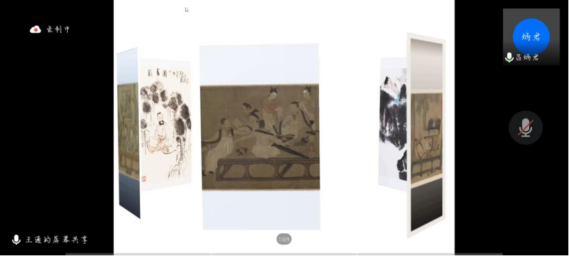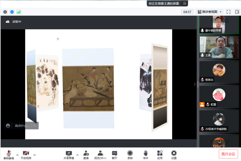 王通结合自身的创作历程向同学们介绍了中国画的主要内容和国画的基础知识,内容涵盖了国画的种类、特点、风格及运用笔墨的方法等,之后利用PPT的形式带领同学们走进中国画中清新淡雅的世界。通过讲解《北齐校书图》《簪花仕女图》《清明上河图》《长安南里王村唐墓壁画》《消夏图》《槐荫消夏图》《九成宫图》《湖庄消夏图》等图,向同学们展示了千百年前的古人度过炎炎夏日的方法,每一幅作品的内容与形式都高度统一,充分体现出古人的聪明才智。针对讲座过程中同学们提出的一些专业方面的问题,王通一一进行了细致、有针对性的解答。
