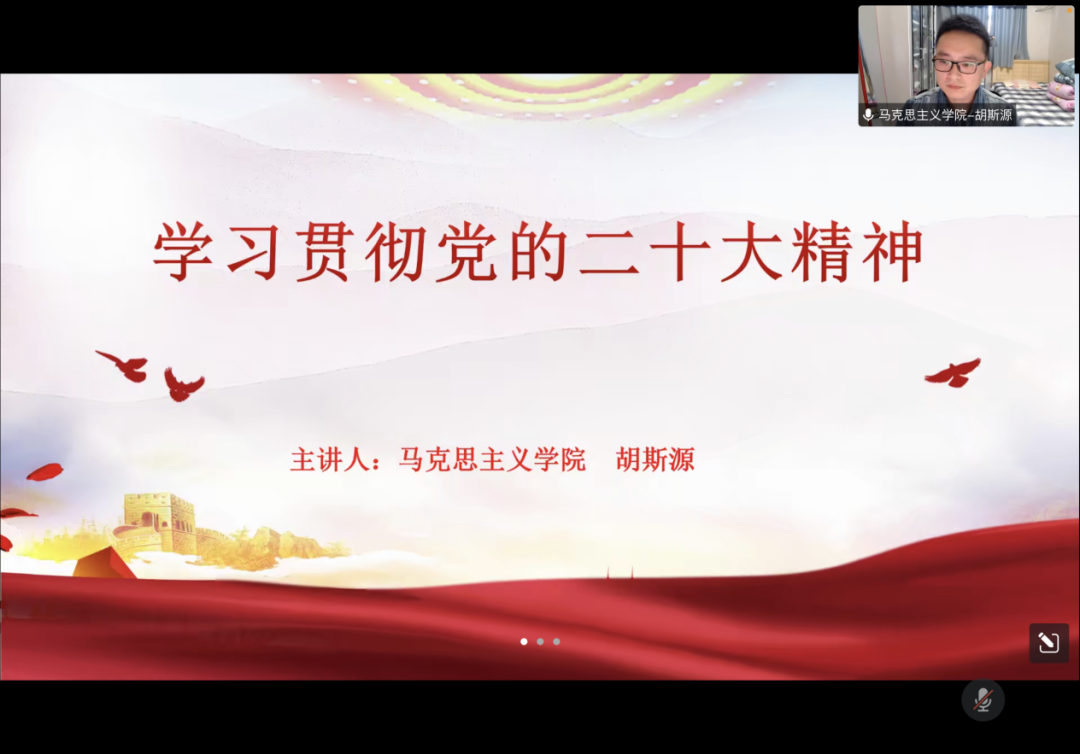 为深入学习贯彻党的二十大精神,切实把广大党员教师的思想和行动统一到党的二十大精神上来,把力量凝聚到党的二十大确定的各项任务上来。12月1日下午,马克思主义学院教师胡斯源以“学习贯彻党的二十大精神”为题,通过线上向外国语学院和政史学院开展宣讲。